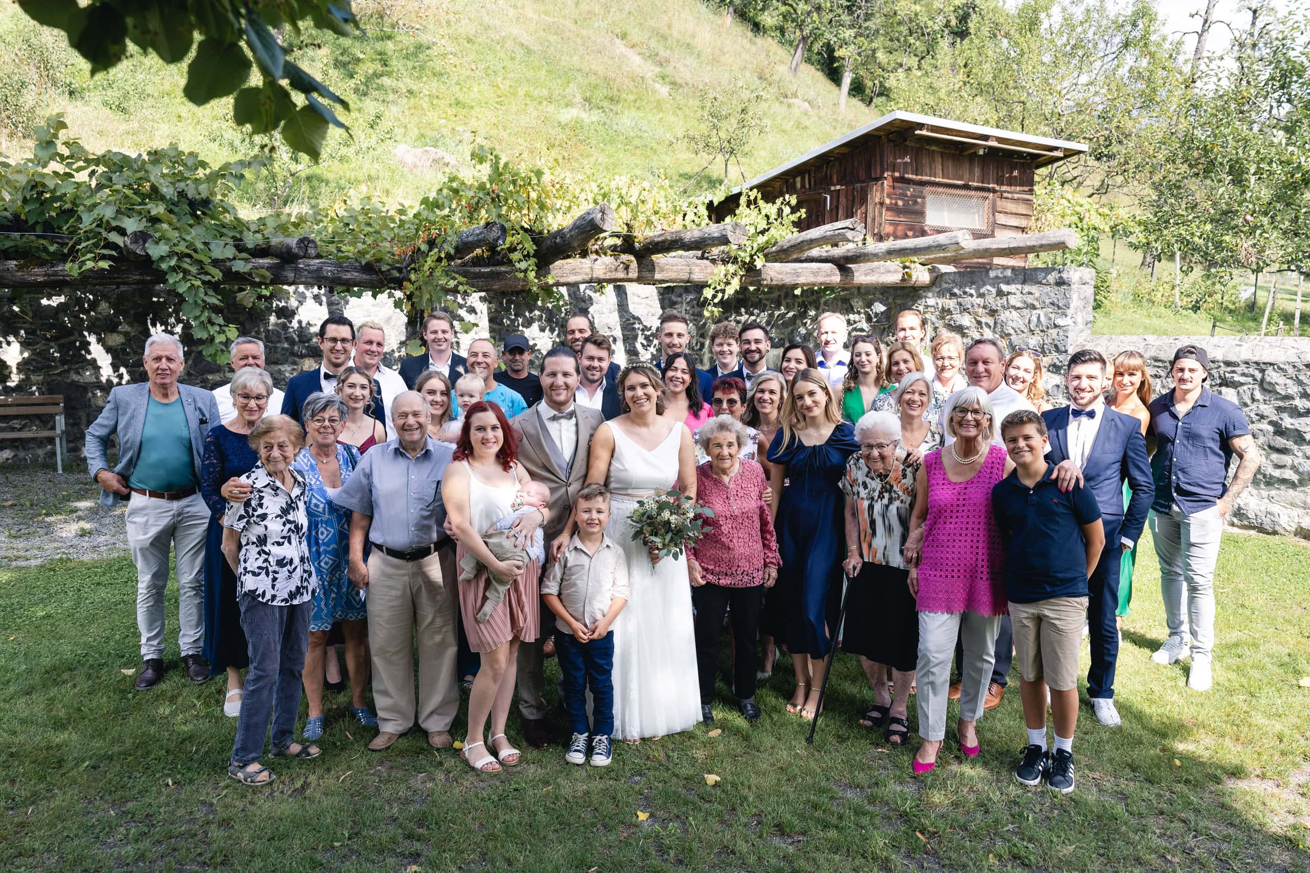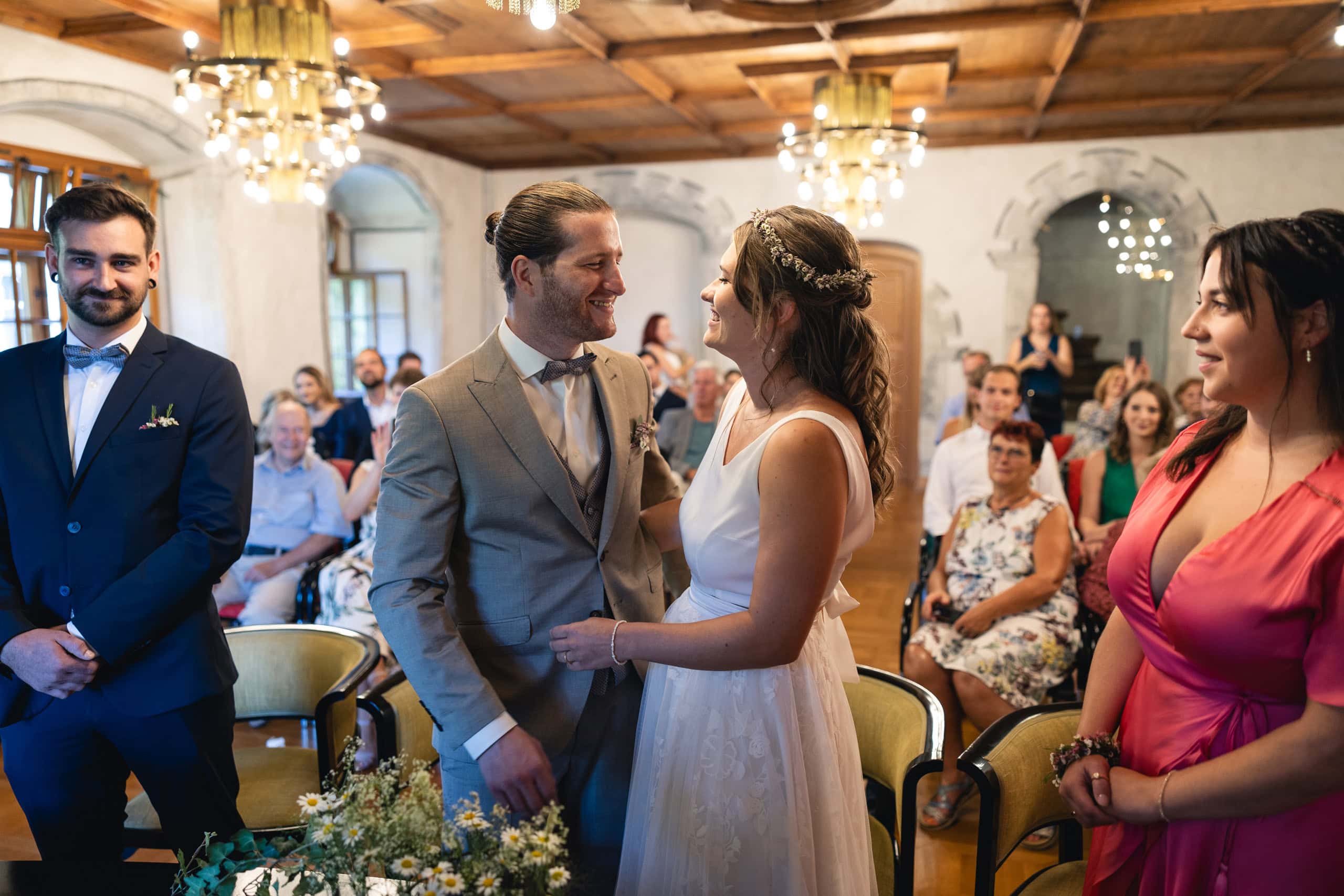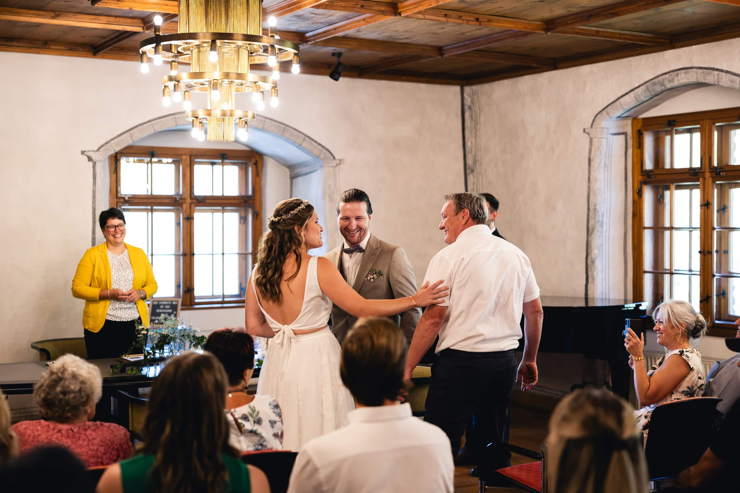 Diese Hochzeit begann mit der standesamtlichen Trauung im Röthner Schlössle. Anschließend ging es zur Agape nach Sulz in ein Gasthaus, bevor der Tag mit einer ausgelassenen Feier im Röthner Vereinshaus seinen Abschluss fand. Diese Abfolge aus Trauung, Begegnung und Feier spiegelt sehr gut wider, wie vielseitig ein Hochzeitstag in Vorarlberg gestaltet werden kann.